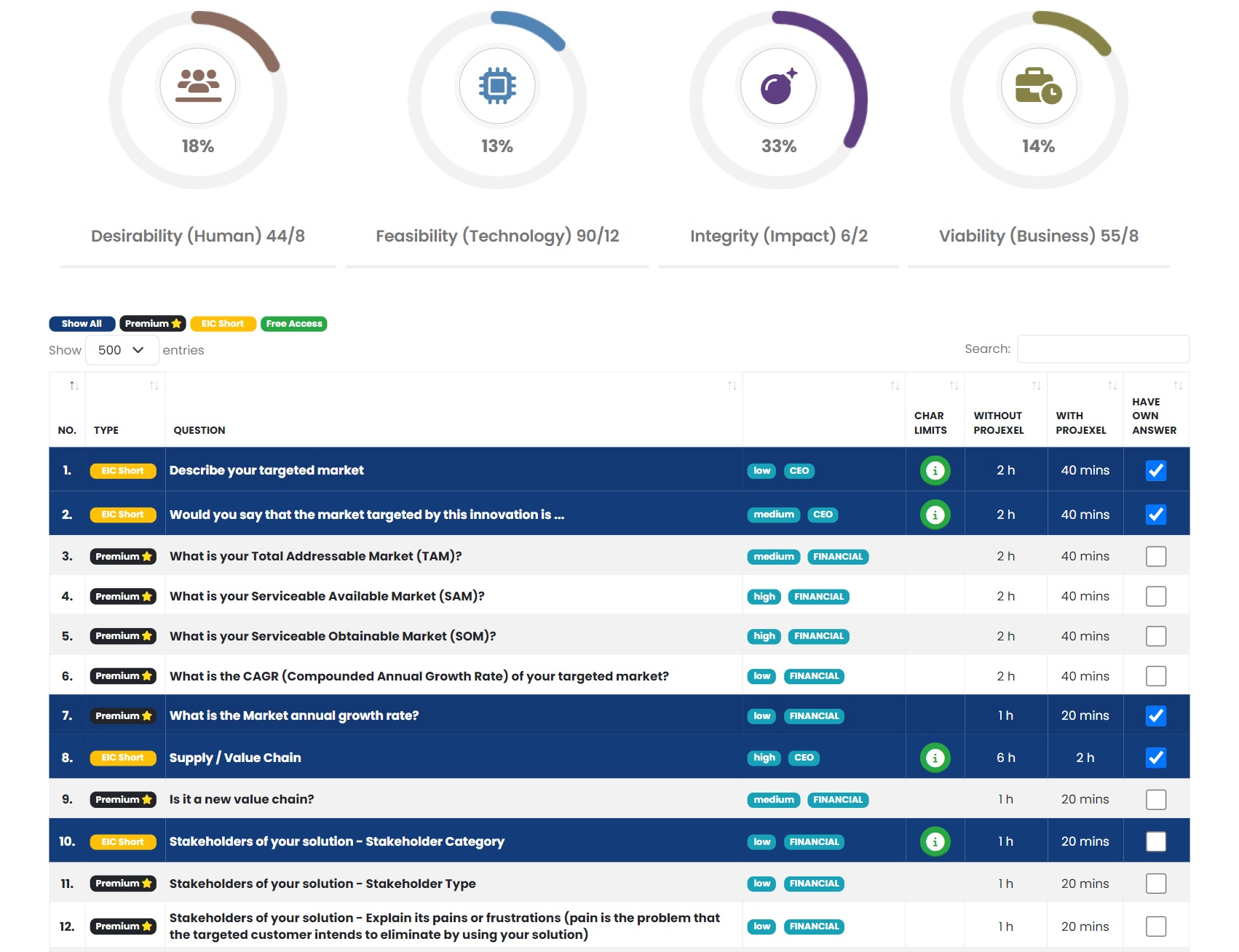 You can also use our premium tool to overview all best-practice strategies for all 200+ EIC Accelerator questions, and thereby understand your company’s position and what needs to be done to provide the ultimate answer to each question.
